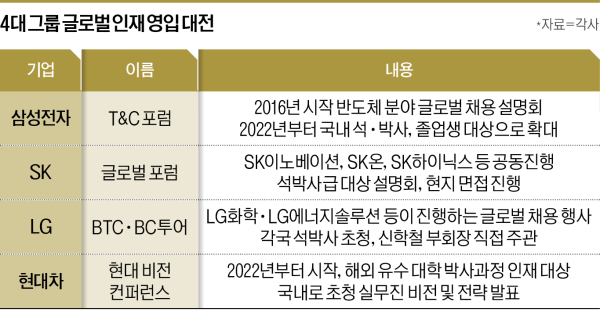 SK그룹도 글로벌 우수 인재 영입을 위해 ‘글로벌 포럼’을 연다. 지난 6월 미국에서 SK이노베이션, SK온, SK하이닉스가 공동으로 개최했다. 포럼에는 김준 SK이노베이션 부회장과 지동섭 SK온 사장 등 주요 경영진이 총출동했고, 석·박사급을 대상으로 기업설명회는 물론이고 현지 면접까지 진행하며 배터리 인재 유치를 위해 소매를 걷어붙였다.