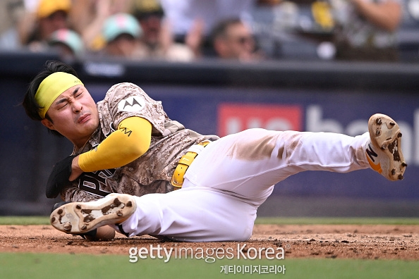 최근 절정의 타격감을 자랑하는 김하성이 홈에서 헤드퍼스트 슬라이딩으로 득점을 올린 후 어깨 통증으로 교체됐다.