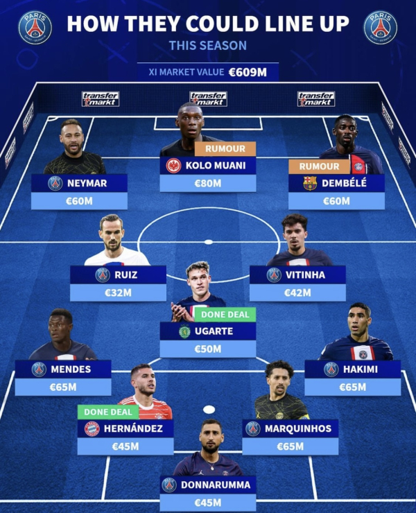 축구 이적 전문 사이트 트랜스퍼마르크트는 지난달 31일(한국시간) “(PSG는) 킬리안 음바페와 마르코 베라티가 없어도 정말 좋은 팀”이라며 2023~24시즌 예상 베스트11을 공개했다. 어디까지나 매체의 의견이 들어간 라인업이며 아직 이적을 확정 짓지 않은 선수들도 포함됐다.