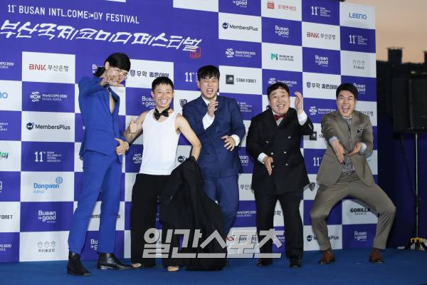 닛몰캐쉬(차청일, 이명재), 보물섬(김동현, 이현석, 강민석)이 25일 오후 부산 영화의 전당 야외극장에서 열린 '부산국제코미디페스티벌(BICF)'(이하 부코페) 개막식 블루카펫 행사에 참석해 포즈를 취하고 있다.