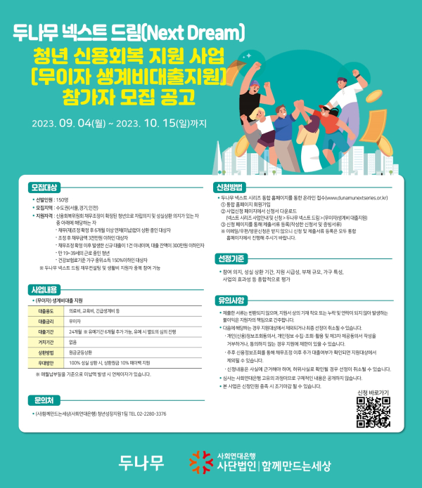 두나무는 부채로 어려움을 겪고 있는 청년들의 신용 회복을 위해 오는 10월 15일까지 '두나무 넥스트 드림'의 무이자 생계비 대출 지원 대상자를 모집한다고 5일 밝혔다.