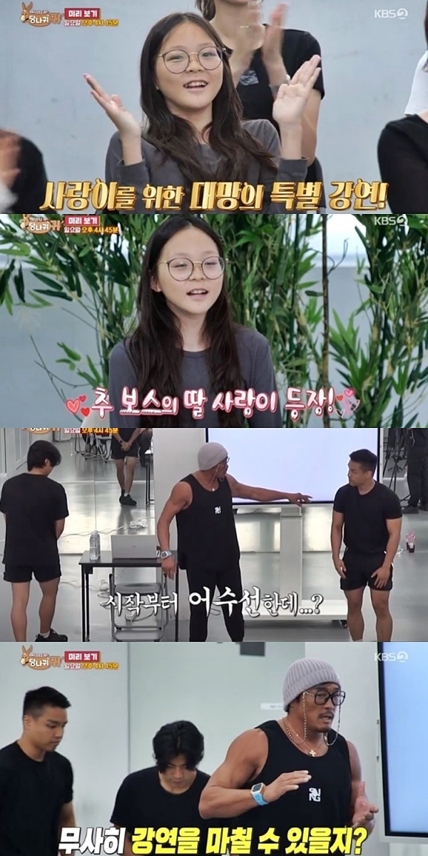 이날 예고편에서 추성훈은 모델 학원에서 모습을 드러냈다. 누군가를 기다리는 듯하더니 그 주인공은 다름 아닌 자신의 딸 추사랑이었다. 추사랑은 “안녕하세요. 추사랑입니다. 11살입니다”라고 성 순해진 모습으로 인사했다.