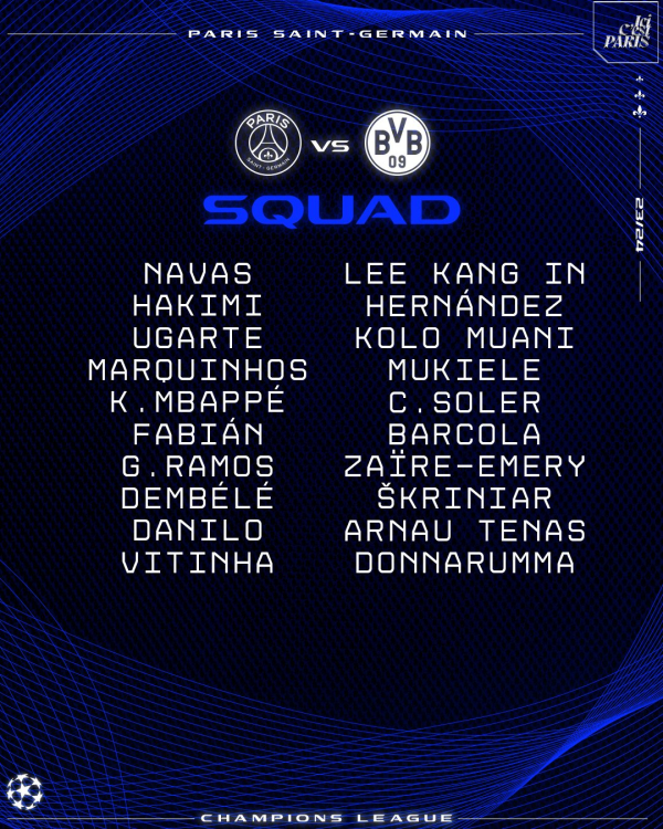과연 이강인이 한 달여 만에 공식전 복귀전을 치를 수 있을지 시선이 모인다. 한편 PSG는 도르트문트전을 앞두고 킬리안 음바페·랑달 콜로 무아니·카를로스 솔레르·마르퀴뇨스·마누엘 우가르테·비티냐·다닐루 페레이라·루카스 에르난데스·밀란 슈크리니아르·잔루이치 돈나룸마 등 20명의 소집 명단을 꾸렸다.