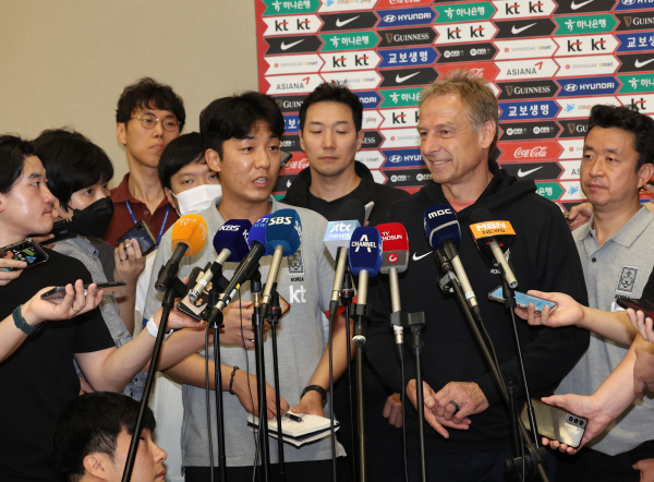 9월 A매치에서 데뷔승을 올린 위르겐 클린스만 한국 남자축구 국가대표팀 감독이 14일 오후 인천공항 제2터미널에서 취재진의 질문에 답하고 있다. 사진=대한축구협회9월 A매치에서 데뷔 승을 올린 위르겐 클린스만 한국 남자축구 국가대표팀 감독이 14일 오후 인천공항 제2터미널에서 취재진의 질문에 답하고 있다. 연합뉴스
