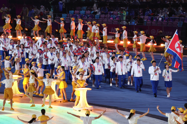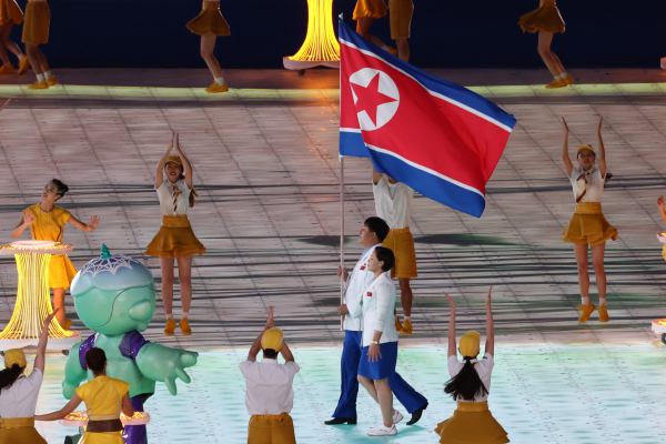 북한은 23일 중국 항저우 올림픽스포츠센터 스타디움에서 열린 AG 개회식에서 알파벳 순서에 따라 7번째로 입장했다. 복싱 방철미와 사격 박명원이 인공기를 들고 공동기수로 입장했고, 뒤를 따르는 북한 선수들도 인공기를 펄럭이며 모습을 드러냈다.