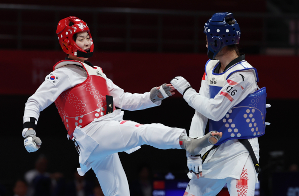 28일 중국 저장성 항저우 린안 스포츠문화전시센터에서 열린 제19회 항저우 아시안게임 태권도 여자 67kg 초과급 결승에서 한국 이다빈이 중국 저우쩌치를 상대하고 있다. 사진=연합뉴스 여자 태권도 간판 스타 이다빈(26·서울시청)이 아시안게임 3연속 개인전 금메달 도전에 실패했다.