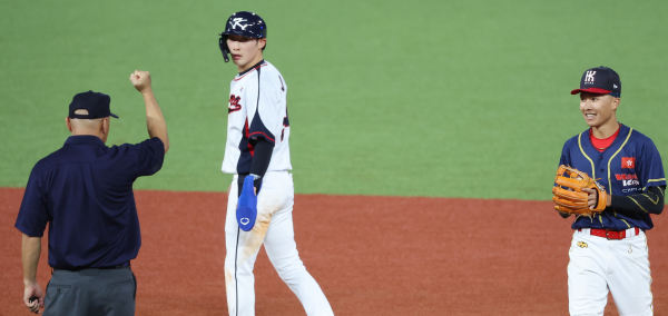 상황은 이랬다. 무사 1, 2루 기회에서 강백호가 날린 타구를 홍콩 우익수가 몸을 날려 잡았다. 이때 안타로 여겨 스타트를 끊은 2루 주자 최지훈(SSG 랜더스)과 1루 주자 노시환(한화 이글스)은 급하게 돌아왔다. 홍콩 야수진은 2루와 1루를 차례로 태그하며 트리플 플레이(삼중살)를 완성한 듯 보였다.