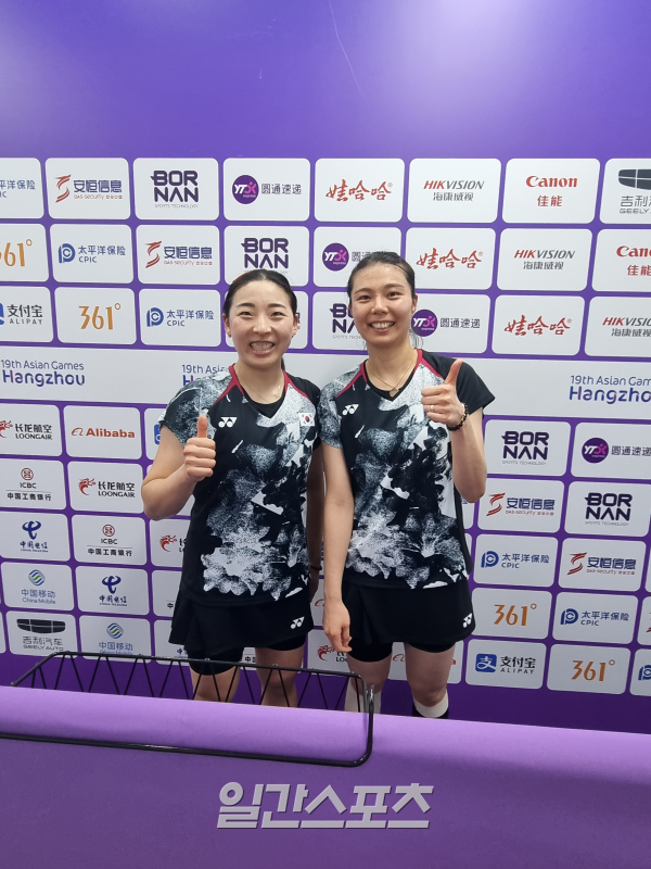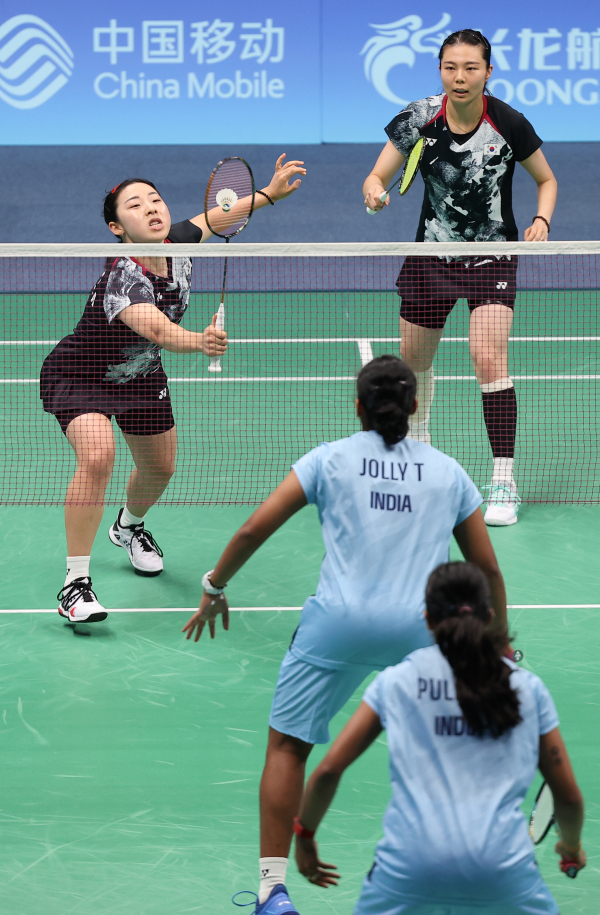 최솔규는 끝까지 포기하지 않고 최선을 다했기에 역전승할 수 있었다"며 "다음 경기에서도 좋은 분위기를 이어갈 수 있도록 집중력을 유지하면서 좋은 모습을 보여드리겠다"고 다짐했다. 김원호는 "예전에는 상대가 두려워 피하는 플레이를 많이 했다. 오늘은 지더라도 한 번 싸워보자는 마음으로 들어간 게 잘 된 것 같다"고 전했다. 4일 중국 항저우 빈장체육관에서 열린 항저우 아시안게임 배드민턴 여자 복식 16강 한국과 인도의 경기. 한국 김소영-공희용이 인도 트리사 졸리-가야트리 고피찬드를 상대하고 있다. 사진=연합뉴스 여자 복식 '킴콩 듀오' 김소영-공희용 조는 인도의 -풀레라 고피챈드 조를 상대로 라운드 스코어 2-1(21-15, 18-21, 21-13) 승리를 챙겼다.