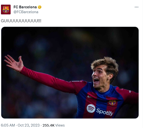 FC바르셀로나(스페인)가 신성 마르크 구이우(17)의 선제 결승 골에 힘입어 승점 3을 확보했다. 구단 공식 소셜미디어(SNS)는 마치 크리스티아누 호날두(알 나스르)가 득점 후 외치는 것처럼, 구이우의 이름을 길게 늘어뜨리며 그의 득점을 조명했다.