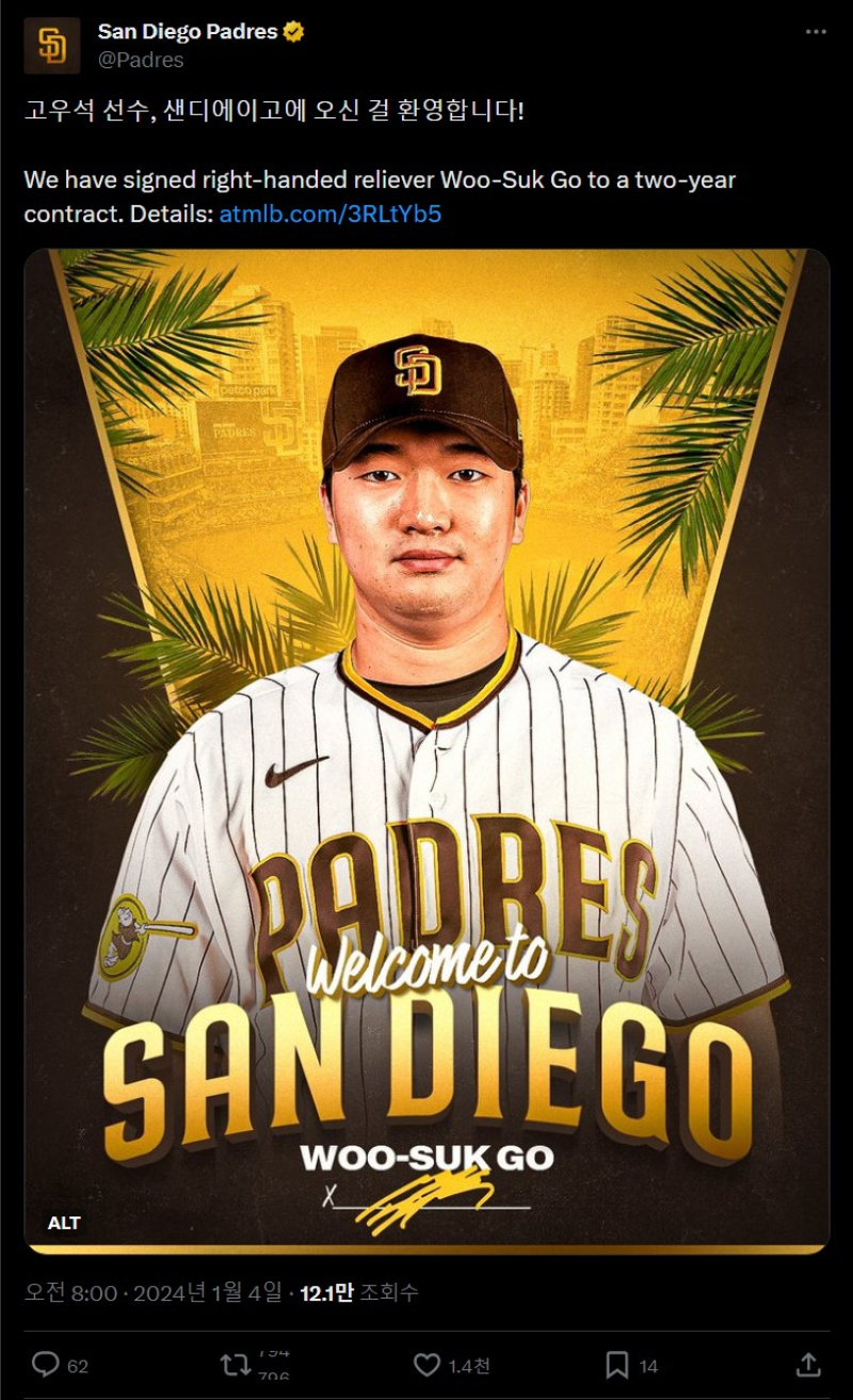 한편 샌디에이고 구단은 공식 소셜미디어 계정을 통해 고우석과 계약 소식을 널리 알렸다. 구단은 한글로 '고우석 선수, 샌디에이고에 오신 걸 환영합니다!'라는 글을 남기고 샌디에이고 유니폼을 입은 고우석의 합성 사진을 공개했다.