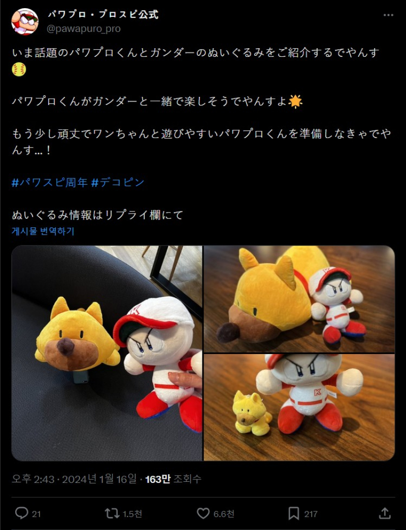 코나미 사의 파워풀 프로야구 공식 트위터. 데코핑에게 찢어진 인형 캐릭터를 소개하고 있다. 사진=파워풀 프로야구 SNS 캡처 코나미는 파워풀 프로야구 공식 계정을 통해 "화제의 파워프로군(마스코트)과 건다(강아지 캐릭터)의 봉제 인형을 소개합니다"라며 "좀 더 튼튼하고 강아지와 놀기 쉬운 파워프로군을 준비하지 않으면 망가지겠네요"라고 전했다.