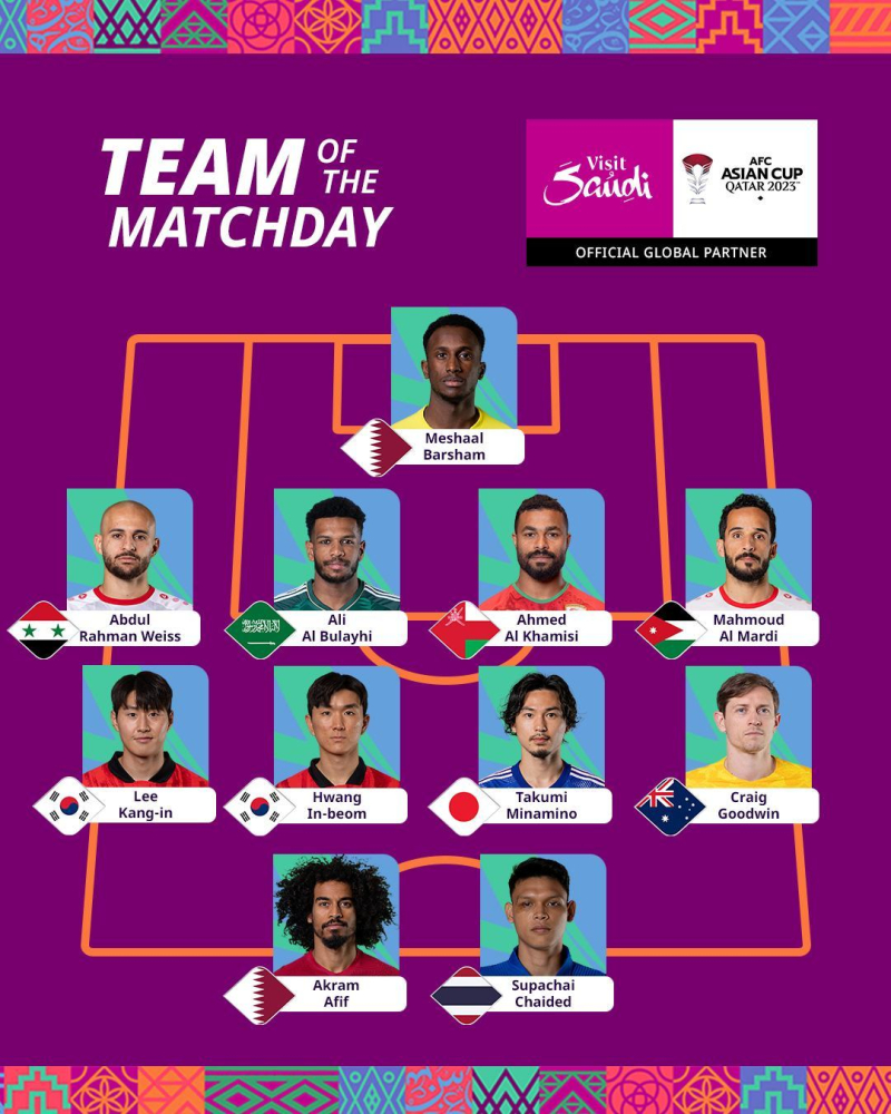 AFC 선정 아시안컵 1라운드의 팀. 한국 이강인과 황인범이 나란히 이름을 올렸다. 2차전 상대인 요르단의 마흐무드 알마르디 역시 포함됐다. 사진=AFC 한국(승점3, +2)에 앞서 조 1위를 차지하고 있는 요르단(승점 3, +4)은 측면에 강점이 있는 팀이다. 특히 1차전 말레이시아와의 경기에서 나란히 멀티 골을 쏘아 올린 왼쪽 수비수 마흐무드 알마르디(알후세인), 오른쪽 공격수 무사 알타마리(몽펠리에)가 핵심 전력으로 꼽힌다. 알마르디 역시 이강인, 황인범과 함께 1라운드 팀에 선정되기도 했다.