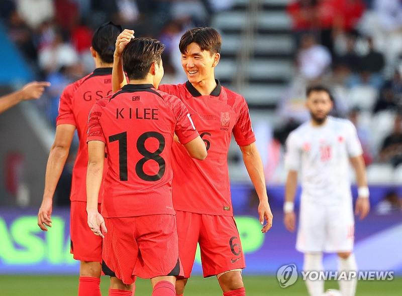 지난 15일 카타르 도하 자심 빈 하마드 스타디움에서 열린 2023 아시아축구연맹(AFC) 아시안컵 조별리그 E조 한국과 바레인의 경기. 이강인이 추가골을 넣은 뒤 황인범의 축하를 받고 있다. 사진=연합뉴스