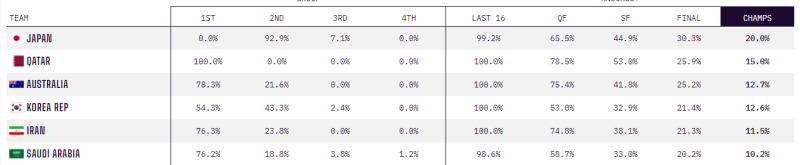 대신 조별리그 2연승으로 16강을 조기 확정한 카타르(9.8%→15%) 호주(10.7%→12.7%)가 한국에 앞섰다. 일본 역시 20%로 크게 하락했지만, 여전히 우승 확률은 1위다.