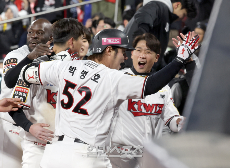 LG 트윈스와 kt위즈의 2023 KBO 한국시리즈 3차전 경기가 10일 오후 수원 KT위즈파크에서 열렸다. kt 박병호가 8회말 LG 마무리 고우석을 상대로 좌월 2점 홈런을 날리고 동료들과 기뻐하고있다. 수원=정시종 기자 capa@edaily.co.kr /2023.11.10.
