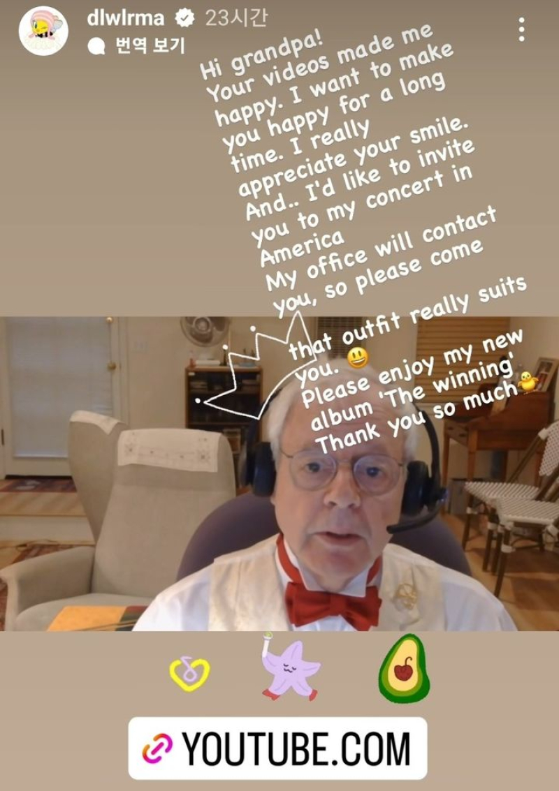 또한 아이유가 자신을 콘서트에 초청했다는 소식을 접한 후 새 영상을 게재했다. 할아버지 팬은 “심장이 너무 빨리 뛴다. 믿을 수 없다”고 감격했다. 그러면서 “아이유는 정말 친절한 사람이다. 그의 재능만큼이나 마음이 훌륭하다. 초청해줘서 고맙다. 나에게 정말 큰 의미”라고 했다.