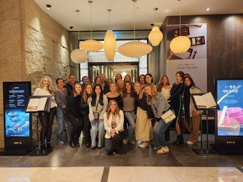 LA 다저스팀의 아내들이 여의도 IFC 내에 위치한 '경복궁'에서 기념사진 촬영을 하고 있다. 사진 제공=엔타스 외식문화 기업 엔타스에 따르면 서울시리즈를 위해 최근 방한한 미국 프로야구 메이저리그(MLB) 로스앤젤러스(LA) 다저스팀 선수단의 아내들이 경복궁 매장을 18일 방문했다고 밝혔다.