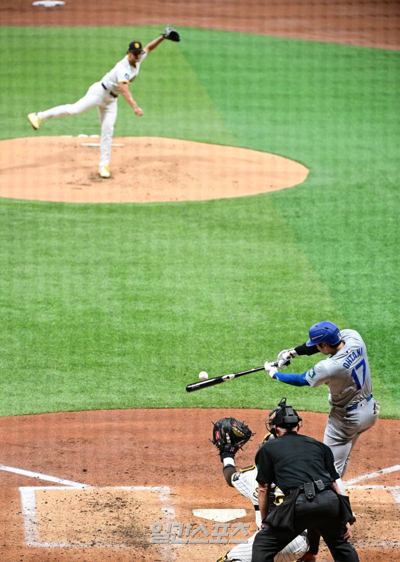 한국에서 사상 최초로 열리는 미국프로야구 메이저리그(MLB) 정규시즌 개막전인 LA다저스와 샌디에이고 파드리스경기가 20일 오후 서울 고척스카이돔에서 열렸다. LA 오타니가 다르빗슈를 상대로 3회 안타를 날리고있다. 고척돔=정시종 기자 capa@edaily.co.kr /2024.03.20.