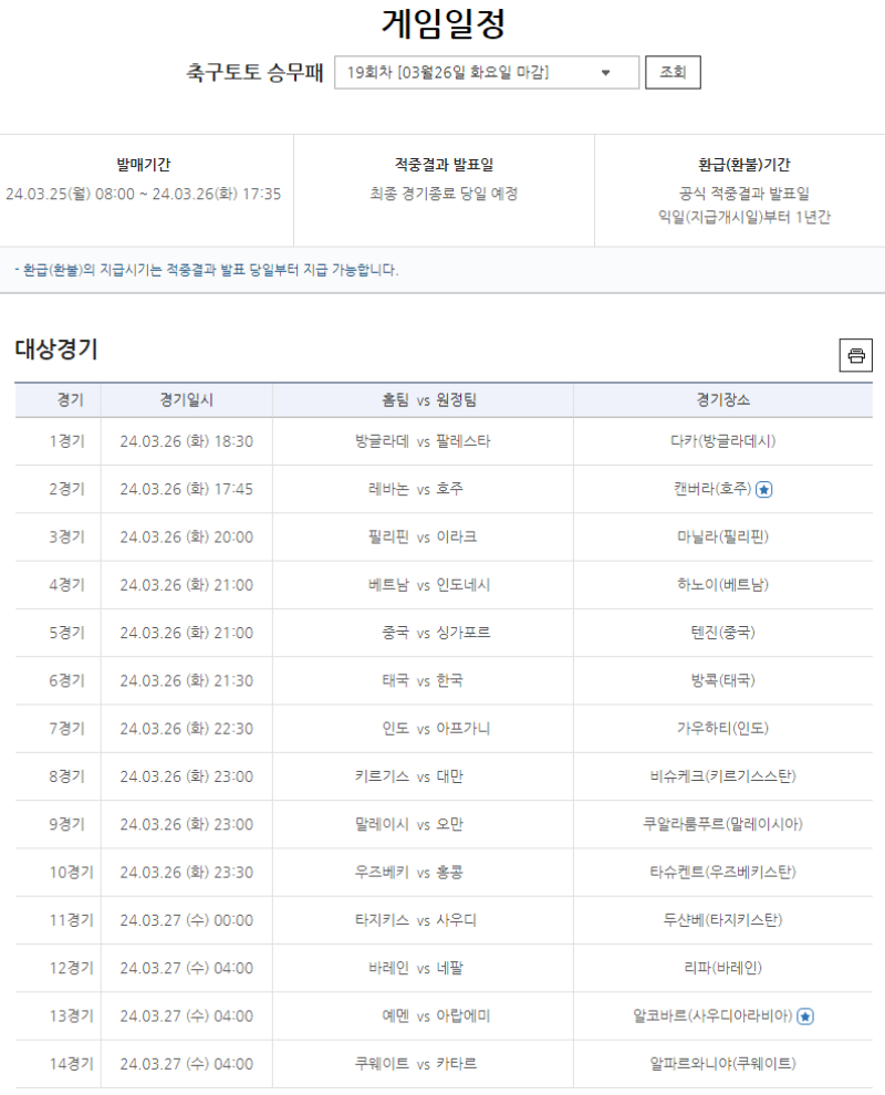 축구토토 승무패 19회차는 3월 25일 오전 8시에 발매를 개시해 오는 26일 오후 5시 35분까지 전국 스포츠토토 판매점 및 공식 온라인 발매 사이트 베트맨을 통해 구매할 수 있으며, 태국-한국(6경기)전을 포함한 2026 FIFA 북중미월드컵 예선 14경기를 대상으로 진행된다.