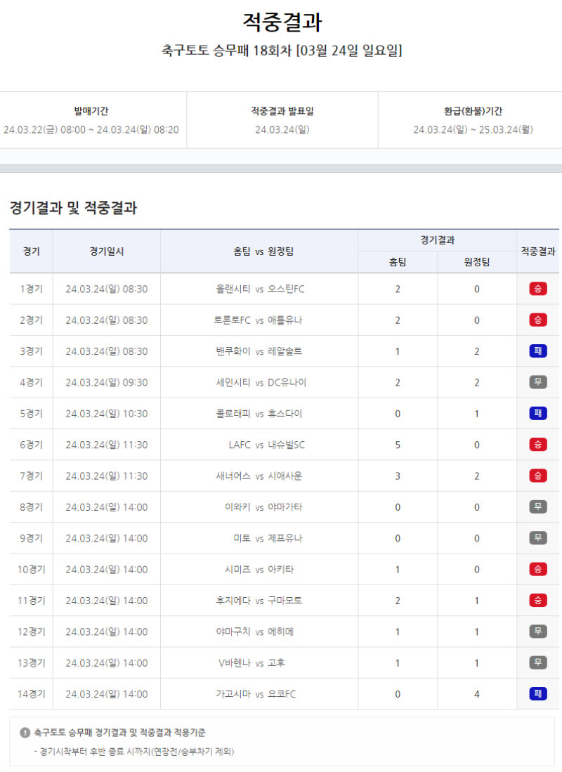 축구토토 승무패 18회차, 무승부 경기 다수 발생하며 1등 적중자 나오지 않아