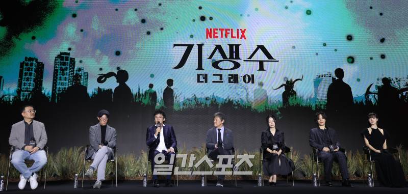 연상호 감독, 류용재 작가, 배우 김인권, 권해효, 이정현, 구교환, 전소니가 26일 오전 서울 용산구 서울드래곤시티에서 열린 넷플릭스 오리지널 '기생수: 더 그레이' 제작발표회에 참석해 MC와 토크를 하고 있다.
