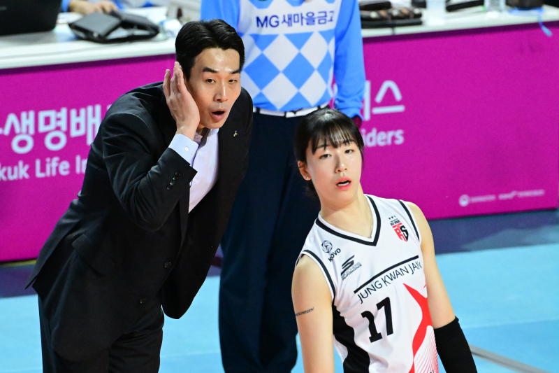 정호영 없이 2차전을 잡았던 정관장. 고희진 감독은 3차전도 정호영을 출전 선수에서 제외했다. 경기 전 만난 그는 "선수의 출전 의지는 정말 컸다. 너무 간절하더라"라고 전하며 "의욕만으로 뛰면 안 된다. 감독은 선수를 보호해야 할 의무가 있다. 정호영은 (현대건설과의 챔프전이 열리는) 수원에서 뛸 수 있도록 할 것"이라고 목소리를 높였다.