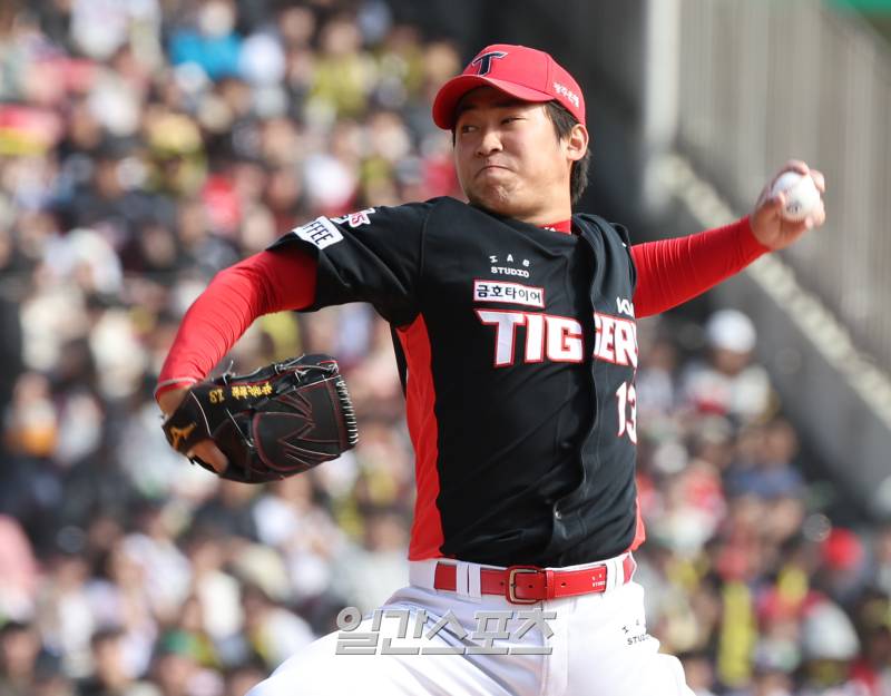 31일 오후 서울 잠실야구장에서 열린 KIA와 두산 경기. KIA 선발 윤영철이 힘차게 공을 던지고있다ㅣ. 잠실=정시종 기자 capa@edaily.co.kr 지난해 신인왕 투표 2위에 오르며 최고의 첫 해를 보낸 윤영철(20·KIA 타이거즈)에게 2년 차 징크스는 없다. 첫 등판부터 무실점 호투로 가볍게 승리를 챙겼다.