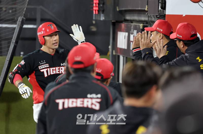 3일 오후 수원 KT위즈파크에서 열린 KIA-KT 경기. KIA 서건창이 4회 우월 2점 홈런을 날린 뒤 더그아웃으로 들어가고 있다. 수원=정시종 기자 capa@edaily.co.kr /2024.04.03.