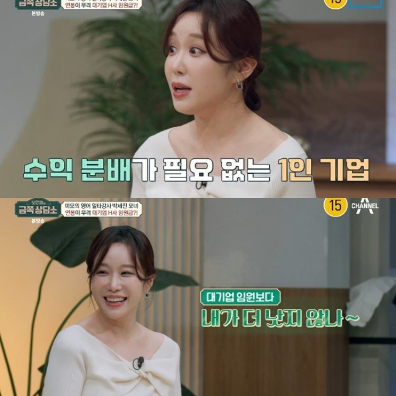 모두가 연봉을 궁금해하자 박세진은 “강사마다 연봉은 천차만별이고 자체 제작 시스템이라 다 제가 한다”면서 “다른 사람보다 수익분배가 많은 필요 없는 1인 기업이다. (반도체) 대기원 임원보다 내가 더 낫지 않나. 세금 떼면 또 모르긴 한다”고 솔직하게 말했다.