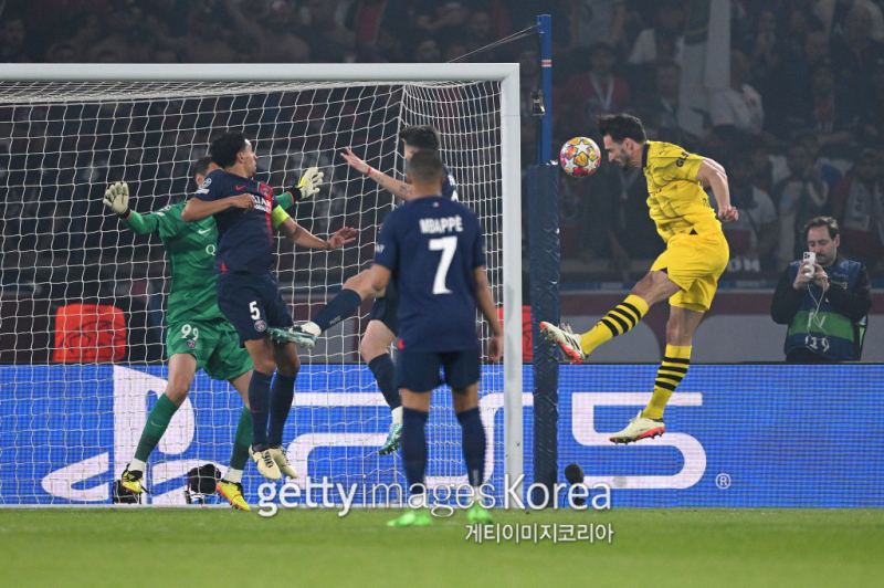 8일 파르크 데 프랭스에서 열린 PSG와 도르트문트의 2023~24 UCL 4강 2차전. 훔멜스(오른쪽)가 코너킥 상황에서 정확한 헤더로 선제골을 넣고 있다. 사진=게티이미지 PSG는 이날 전방에 음바페·곤살루 하무스·우스만 뎀벨레를 내세웠다. 중원은 파비안 루이스·비티냐·자이르-에머리였다. 백4는 멘데스·루카스 베랄두·마르키뉴스·아치라프 하키미, 골키퍼 장갑은 잔루이지 돈나룸마가 꼈다. 이강인은 다시 한번 벤치에서 출격을 대기했다.