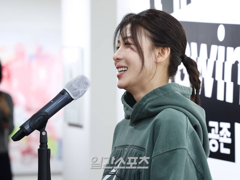 하지원 작가가 17일 오후 서울 중구 순화동 KG타워 갤러리선에서 열린 하지원 초대 개인전 ‘핑크 드로잉: 코이그지스턴스 공존’(Pink Drawing : Coexistence 공존) ‘작가와의 만남’ 이벤트에 참석해 인사말을 하고 있다.