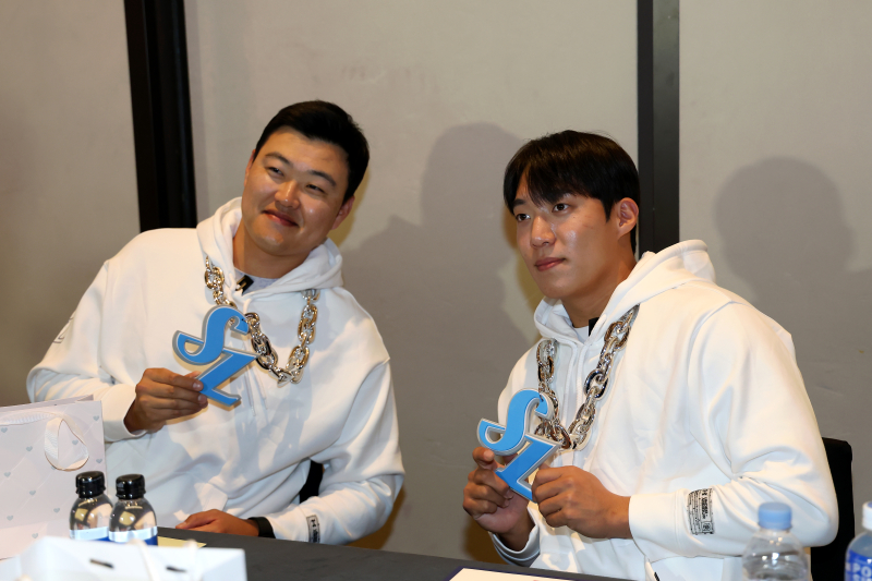 2021년 원태인과 오재일. 삼성 제공2023년 미디어데이에 나선 오재일-원태인. 삼성 제공