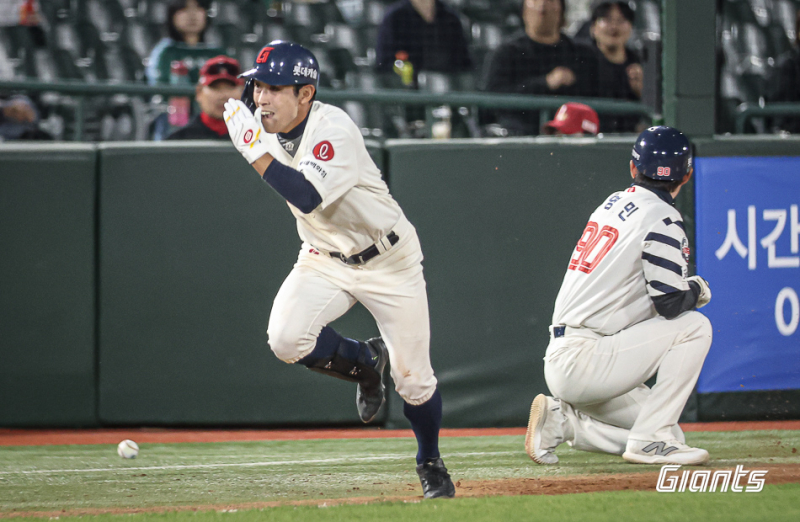 허경민과 도슨의 득점 창출 능력은 주로 타격에서 나왔다. 허경민은 리그 타율 1위(0.387) 도슨은 안타 1위(82개)를 기록 중이다. 반면 황성빈은 41경기에서 남긴 타율(0.356)과 출루율(0.431)도 높은 편이지만, 누상에서 더 돋보였다. 도루는 리그 공동 3위 기록인 20개를 해냈다. 성공률은 95.2%. 실패는 딱 한 번뿐이었다. 병살타도 없었다.