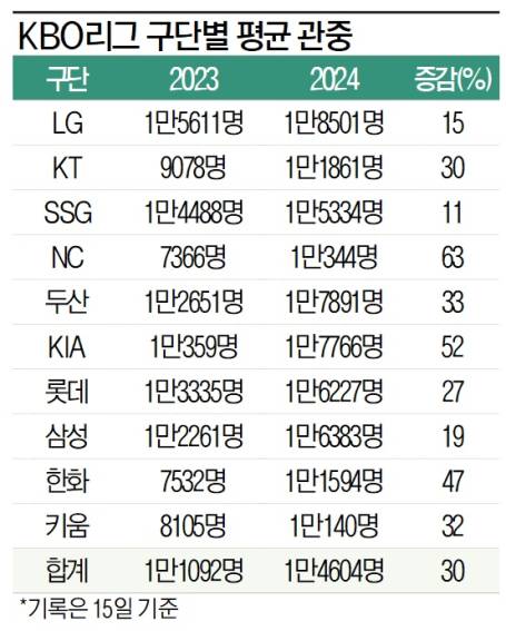 올 시즌 프로야구 인기는 특정 구단에 의존하지 않는다. 10개 구단 모두 전년 대비 10% 이상 관중이 늘었다. 20% 이상 향상한 구단만 7개. 특히 NC 다이노스(평균 7366명→1만344명)와 KIA 타이거즈(1만359명→1만7766명)의 관중 증가 폭은 각각 63%, 52%에 이른다. 15일 기준으로 리그 경기당 평균 관중은 지난해 1만1092명에서 30% 증가한 1만4604명. B 구단 관계자는 "과거에는 특정 인기 매치업에 관중 쏠림 현상이 심했는데 올해는 그 정도가 덜하다. 주말은 물론, 평일에도 관중이 꾸준히 유입되고 있다. 깜짝 놀랄 정도"라고 말했다.