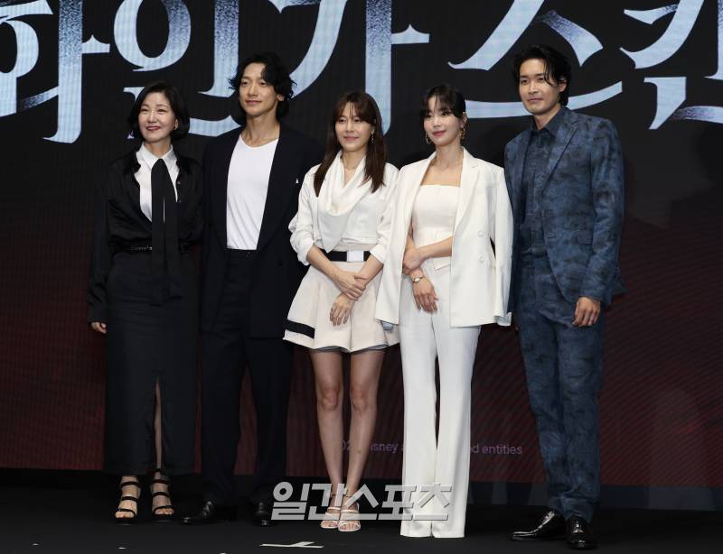 배우 서이숙, 비(정지훈), 김하늘, 기은세, 정겨운(왼쪽부터)이 2일 오전 서울 영등포구 콘래드 호텔에서 열린 디즈니+ 오리지널 '화인가 스캔들' 제작발표회에 참석해 포즈를 취하고 있다.