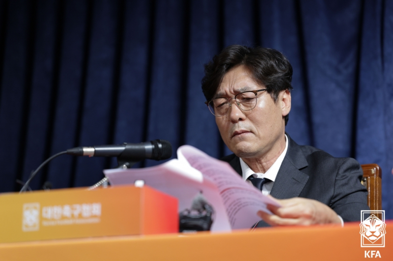 이임생 KFA 기술본부 총괄이사가 8일 축구회관에서 열린 홍명보 감독 내정 관련 브리핑 중 자료를 읽고 있다. 사진=대한축구협회 홍명보 울산 HD 감독이 차기 한국 축구대표팀의 정식 사령탑으로 임명됐다. 소식을 접한 축구팬들은 비판의 목소리를 연이어 내뱉으며 싸늘한 시선을 보냈다.