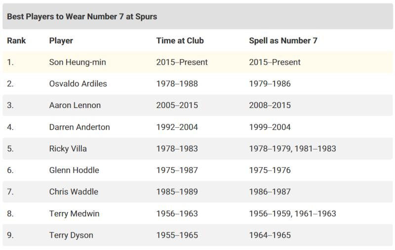 손흥민의 뒤를 이어 1978년부터 1988년까지 토트넘에서 뛰었던 오스발도 아르딜레스가 2위에 올랐다. 에런 레넌(2005~2015·토트넘 소속 기간), 대런 앤더튼(1992~2004), 리키 비야(1978~1983), 글랜 호들(1975~1987), 크리스 워들(1985~1989), 테리 메드윈(1956~1963), 테리 다이슨(1955~1965)도 차례로 선정됐다.