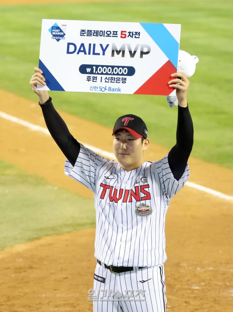 손주영은 "에르난데스를 지켜야 한다고 생각해 더 집중하고 던졌다. 에르난데스가 (플레이오프 1~2차전이 열리는) 대구에서서도 던져야 하니까 '내가 5차전 마지막까지 책임져야 하나'라는 생각까지 했다"라고 웃었다. 11일 오후 잠실야구장에서 열린 KT위즈와 LG트윈스의 2024 신한쏠뱅크 KBO포스트시즌 준플레이오프 5차전. LG가 4-1 승리, 플레이오프에 진출했다. 경기종료후 시상식에서 LG 손주영이 데일리 MVP를 받고 있다. 잠실=정시종 기자 capa@edaily.co.kr /2024.10.11. 3차전과 5차전에서 데일리 MVP를 받은 손주영은 "사실 컨디션 조절이 쉽지는 않았다. 1~2차전 때는 너무 피곤했다. 3차전 때 던지고 나서 4차전을 경기 보는 데 너무 긴장돼서 더 힘들었다"라며 "트레이닝 파트에서 계속 마사지를 해주고, 개인적으로 다니는 한의원 원장님도 몸 관리를 많이 도와주셔서 감사드린다"라고 인사했다.