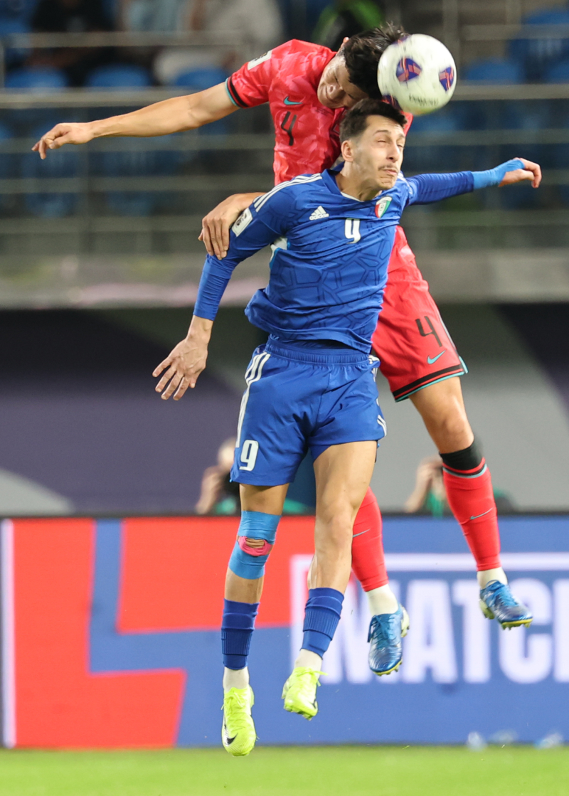 헤더 시도하는 김민재 (쿠웨이트시티=연합뉴스) 황광모 기자 = 14일 오후(현지시간) 쿠웨이트 자베르 알 아흐메드 국제 경기장에서 열린 2026 북중미 월드컵 아시아지역 3차 예선 B조 5차전 한국과 쿠웨이트의 경기. 한국 김민재가 헤더를 시도하고 있다. 2024.11.14 hkmpooh@yna.co.kr/2024-11-14 23:50:55/ <저작권자 ⓒ 1980-2024 ㈜연합뉴스. 무단 전재 재배포 금지, AI 학습 및 활용 금지> 홍명보호가 다양한 공격 패턴으로 호평받는다면, 세트피스 수비에선 다소 의문부호를 남기고 있다.