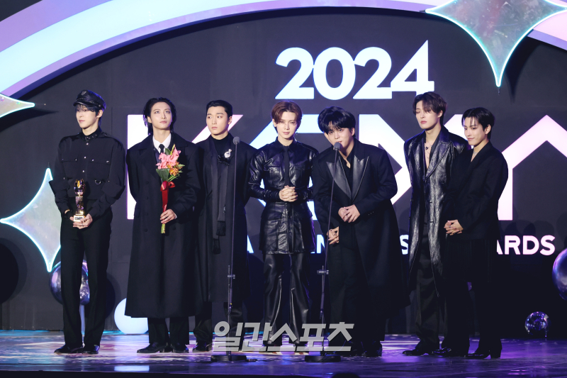 [2024 KGMA] 그룹 에이티즈가 17일 인천 중구 운서동 인스파이어 아레나에서 열린 '2024 코리아그랜드뮤직어워즈(KGMA)' 둘째날 송데이에서 ‘베스트 송’상을 수상하고 수상소감을 밝히고 있다. 일간스포츠(이데일리M)가 주최하고 KGMA 조직위원회가 주관하는 '2024 KGMA'는 올해 창간 55주년을 맞은 일간스포츠가 대한민국 대중음악계에 새로운 패러다임을 제시하기 위해 새롭게 개최하는 시상식으로 16, 17일 이틀간 펼쳐졌다. 영종도(인천)=KGMA특별취재반 /2024.11.17/ 그룹 에이티즈가 제1회 코리아 그랜드 뮤직어워즈 베스트 송을 수상했다.
