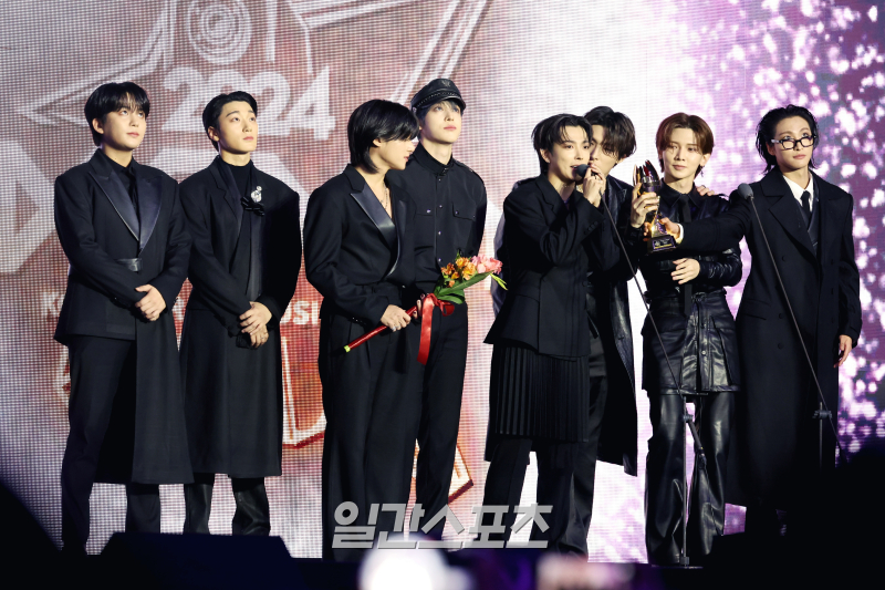 [2024 KGMA] 그룹 에이티즈가 17일 인천 중구 운서동 인스파이어 아레나에서 열린 '2024 코리아그랜드뮤직어워즈(KGMA)' 둘째날 송데이에서 ‘2024 그랜드 아너스 초이스’을 수상하고 수상소감을 밝히고 있다. 일간스포츠(이데일리M)가 주최하고 KGMA 조직위원회가 주관하는 '2024 KGMA'는 올해 창간 55주년을 맞은 일간스포츠가 대한민국 대중음악계에 새로운 패러다임을 제시하기 위해 새롭게 개최하는 시상식으로 16, 17일 이틀간 펼쳐졌다. 영종도(인천)=KGMA특별취재반 /2024.11.17/ 그룹 에이티즈가 제1회 코리아 그랜드 뮤직어워즈 2024 그랜드 아너스 초이스를 수상했다.