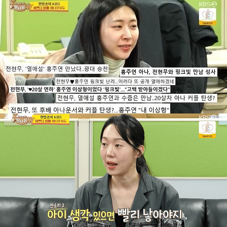 이날 엄지인은 “연애는 안 하니? 네 연애에 사람들이 관심이 많더라”고 홍주연에게 질문했다. 앞서 홍주연은 전현무가 자신의 이상형이라고 밝혔던바. 두 사람 사이에 ‘열애설’도 제기됐었다. 홍주연은 전현무와의 열애설에 “부담스럽다”라고속내를 밝혔다.