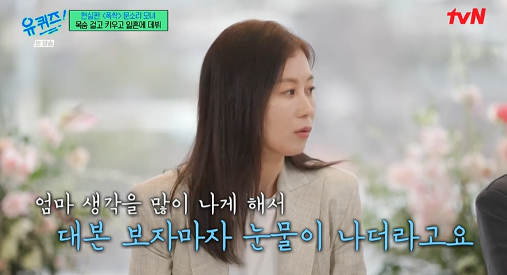 이날 문소리는 넷플릭스 12개국 1위 소식에 “축하 전화는 아이유가 받겠죠. 저는 그렇게 받진 않는다”라고 너스레를 떨면서 “그보다도 정말 좋은 대본이다. 제가 맡은 캐릭터가 오애순 역인데 51년생”이라고 말했다. 사진=‘유 퀴즈 온 더 블록’ 캡처 그러면서 “엄마(이향란)가 52년생이라 엄마 생각이 많이 났다. 오애순의 삶을 보면 어릴 적에 굉장히 꿈이 많고 섬 소녀다”라며 “결혼 일찍하고 자식 키우는데 평생을 열심히 살고 그러면서 끝까지 꿈을 잃지 않는 이야기들이 엄마 생각이 많이 나서 대본 보자마자 눈물이 났다”라고 덧붙였다.