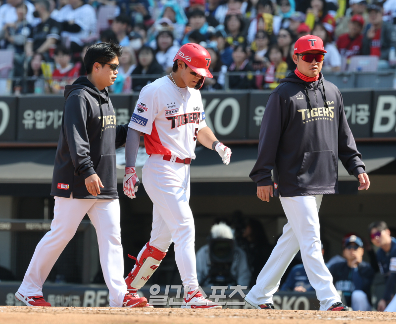 김도영은 타구 왼쪽 선상으로 흐르자, 2루 진루를 노리다가 NC 외야수가 공을 잡아 송구할 때 제동을 건 뒤 1루로 귀루했다. 하지만 그 순간 허벅지에 통증이 생긴 듯 다리를 저는 모습을 보였다.