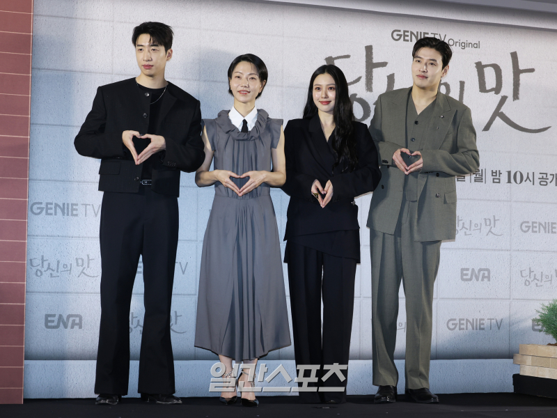 배우 유수빈, 김신록, 고민시, 강하늘이 8일 오후 서울 마포구 스탠포드호텔에서 열린 지니TV 오리지널 '당산의 맛' 제작발표회에 참석해 포즈를 취하고 있다.