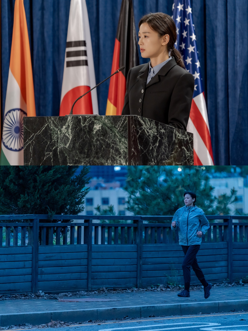 이날 공개된 캐릭터 스틸에는 유엔대사로 활동하며 당차고 기품 있게 연설하는 문주의 눈빛이 포착, 그의 올곧은 심성을 엿보게 한다. 뿐만 아니라 새벽부터 러닝을 나서는 모습은 그의 단단하고 강인한 일상을 보여준다. 또 날카로운 눈빛으로 숨겨진 진실에 다가가는 담대한 모습은 문주 캐릭터에 대한 흥미로운 궁금증을 안긴다.