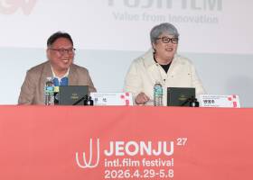 제27회 전주국제영제 가자회견 참석한 문석과 변영주 프로그래머