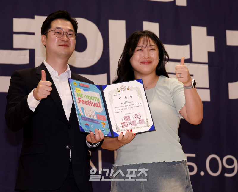 크리에이터 까플러가 청년의 날 축제 크리에이터 조직위원회 위원으로 위촉돼 김동아 국회의원에게 위촉패를 받고 함께 포즈를 취하고 있다.