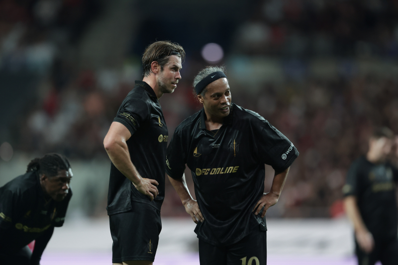 이후 스피어는 호나우지뉴를 앞세운 측면 공격을 시도했는데, 유효타로 이어지진 않았다. 전반은 0-0으로 팽팽히 맞선 채 마무리됐다. 14일 서울월드컵경기장에서 열린 2025 아이콘매치 FC 스피어와 실드 유나이티드의 경기. 스피어 베일(왼쪽)과 호나우지뉴가 프리킥 전 대화를 나누고 있다. 사진=넥슨