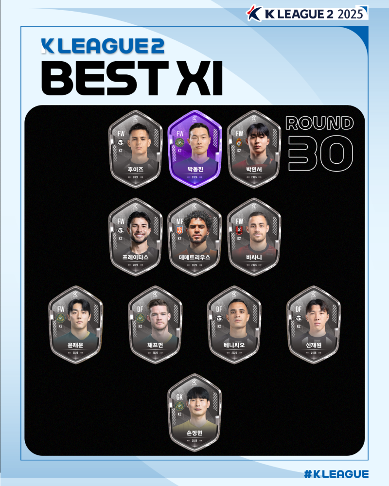 23일 공개된 K리그2 2025 30라운드 베스트11. 사진=프로축구연맹 성남FC은 20일 탄천종합운동장에서 열린 충남아산과의 경기에서 상대 자책골과 후이즈, 이정빈의 연속골에 힘입어 3-0 대승을 거뒀다. 이날 승리로 성남은 K리그2 30라운드 베스트 팀에 선정됐고, 후이즈, 프레이타스, 베니시오, 신재원은 라운드 베스트11에 이름을 올렸다.